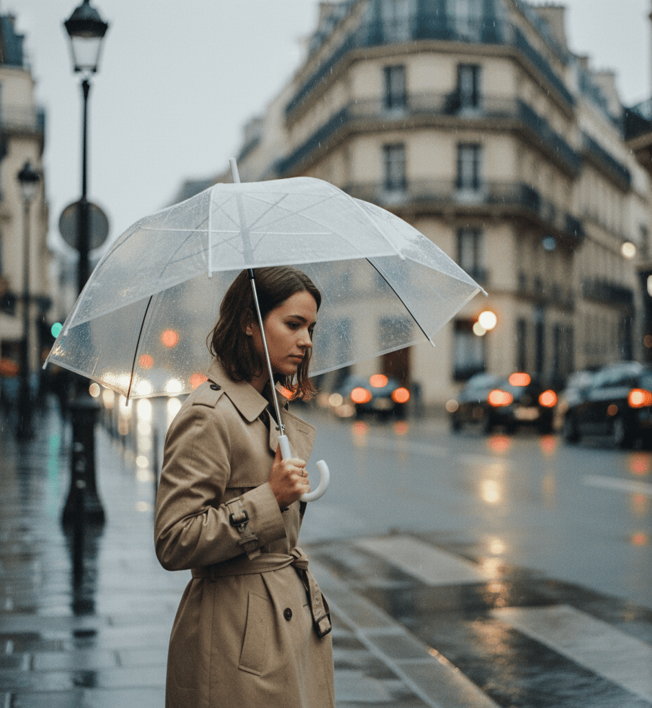 young woman, with a thoughtful expression, standing alone on a rainy street in Paris, shot in the style of cinematic street photography. Medium shot, rule of thirds, using a prime lens with shallow depth of field, natural soft light, moody and nostalgic tone, high resolution, film grain.