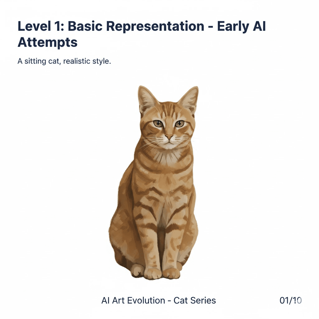 今天,我们将通过一个特别的主题——超写实猫咪——来一场视觉盛宴,带你领略AI作图从“新手小白”(0级)到“大师级”(10级)的惊人蜕变。我们将见证AI如何从理解简单的猫形,到捕捉猫咪的灵魂深处,每一张图片都代表着AI在处理细节、光影、情感和艺术复杂性上的一个里程碑。