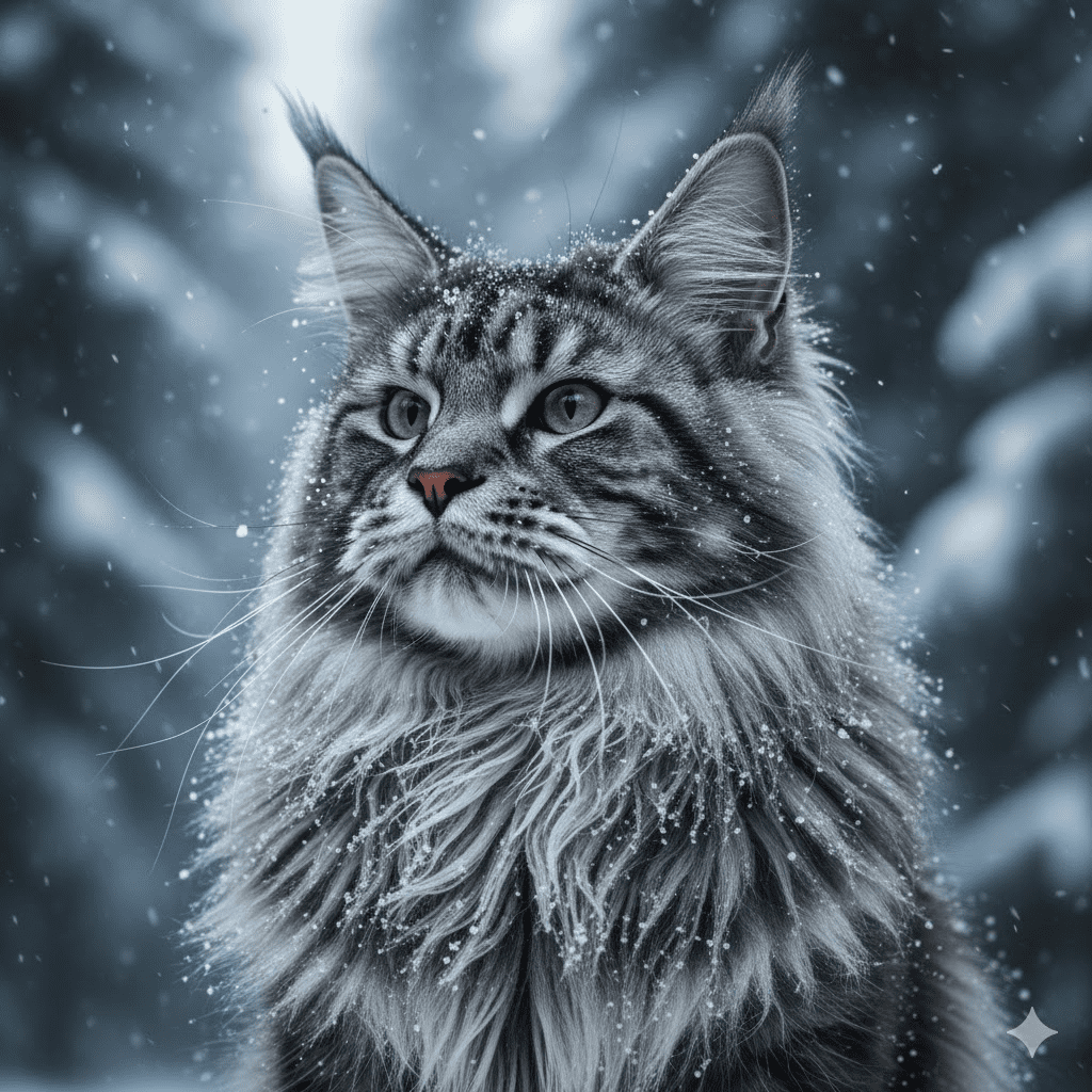指令: 一只威严的缅因猫肖像,眼神深邃,背景是雪花飘落的松林,毛发上挂着细小的雪珠,电影级光效,超写实特写。