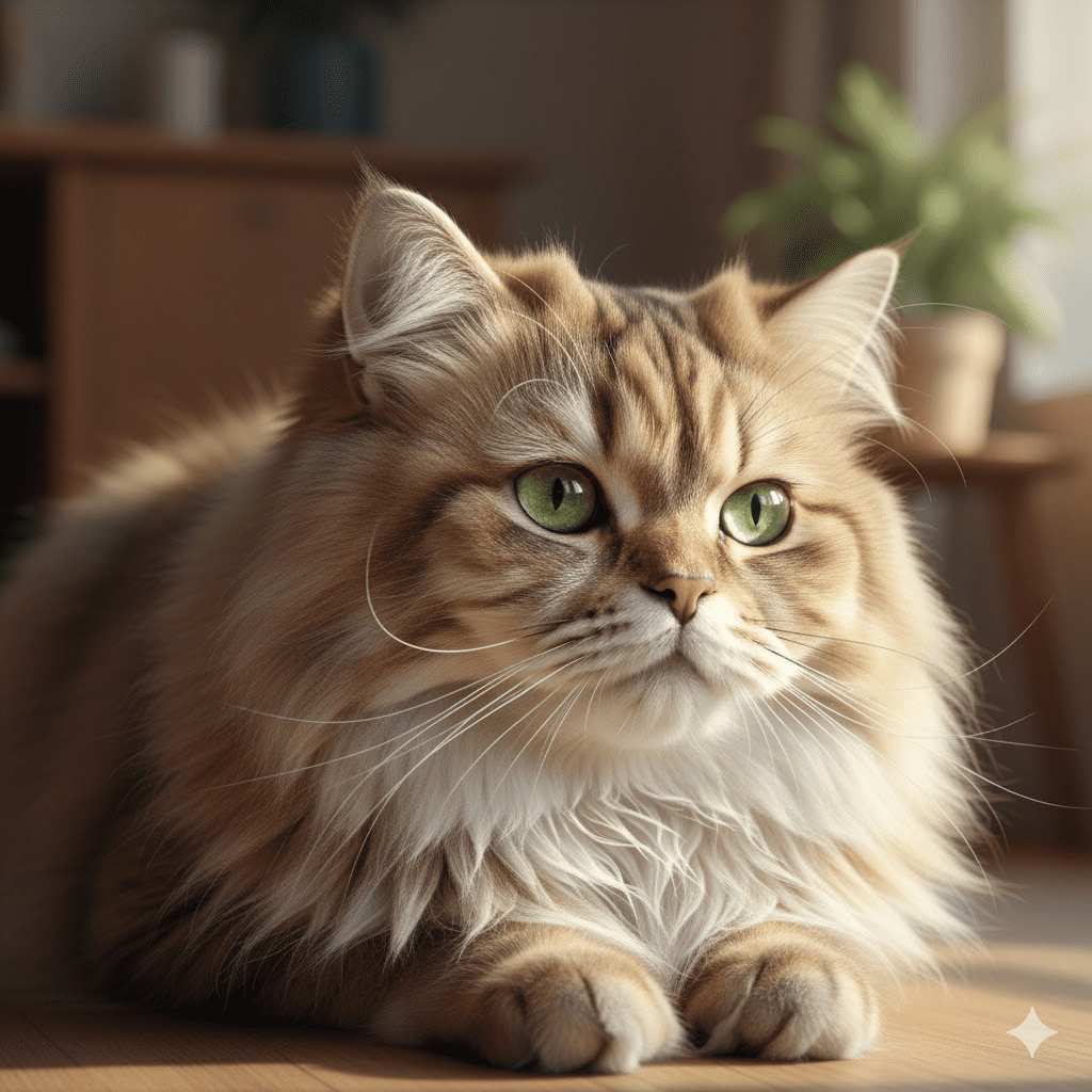 指令: 一只安静地趴在阳光下的波斯猫,毛发蓬松柔软,每一根毛发都清晰可见,眼睛晶莹剔透,反射着窗外的光线。鼻头湿润,胡须纤毫毕现。光线从侧面打入,形成完美的阴影和高光,背景虚化但依稀可见家庭环境的温馨,超高分辨率,电影级特写。