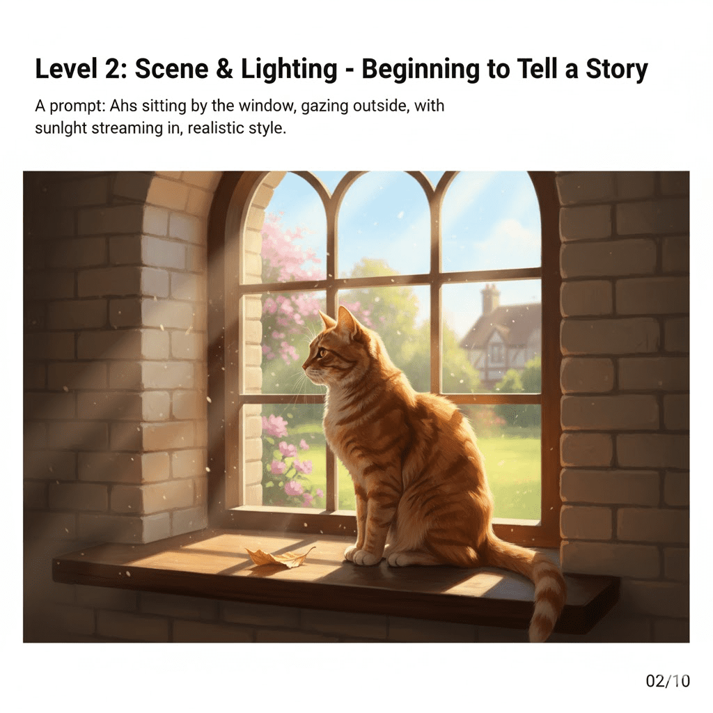 AI表现: AI开始理解简单的场景描述,并尝试融入光影效果。猫的姿态更自然,画面有了情境感,阳光洒进来的效果也初见端倪。但毛发细节和整体真实感仍有提升空间。