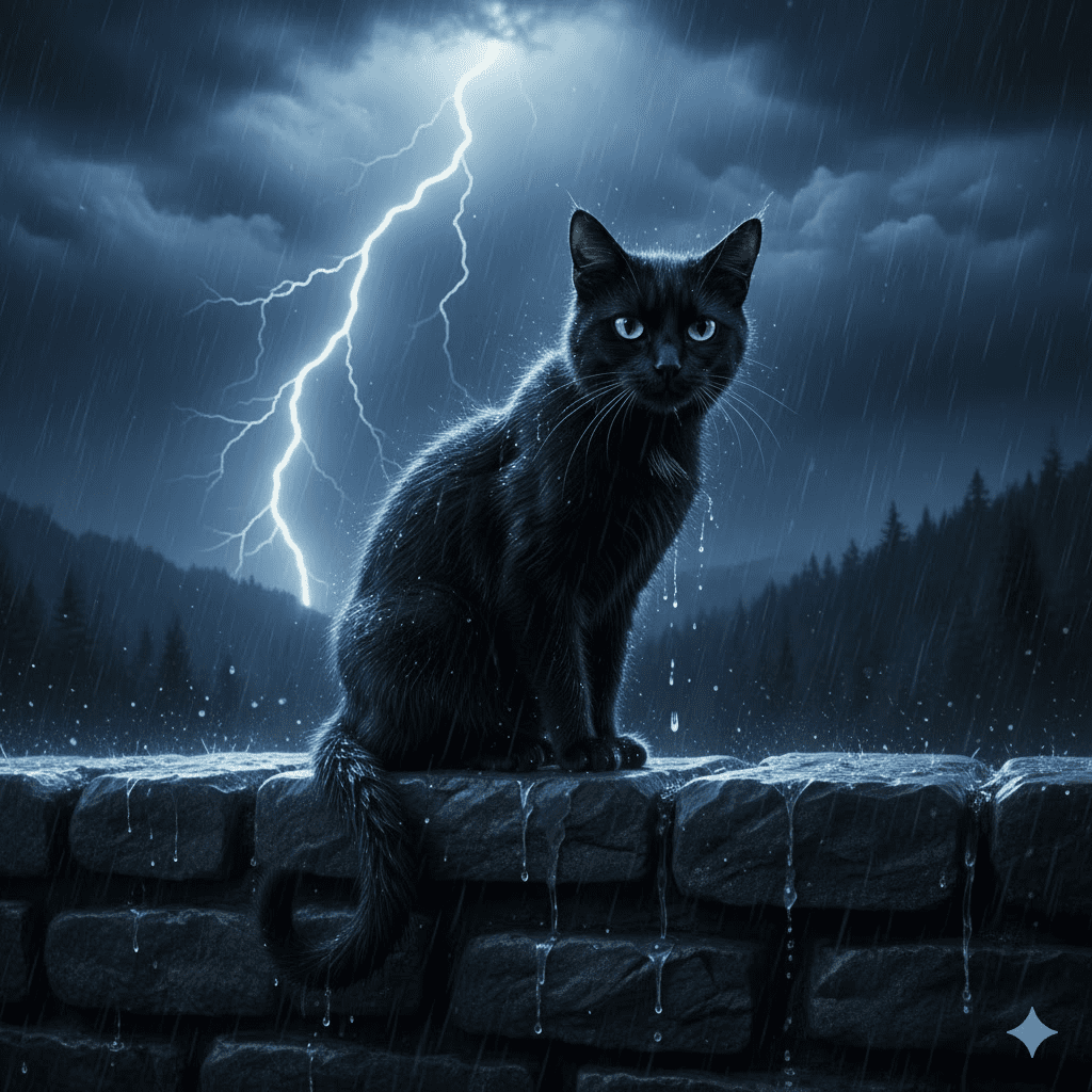指令: 一只黑猫在暴风雨之夜,蹲坐在古老城堡的石墙上,闪电划破夜空照亮猫的轮廓和湿漉漉的皮毛,雨水滴落,背景是翻腾的乌云和远处的森林,超写实电影剧照。