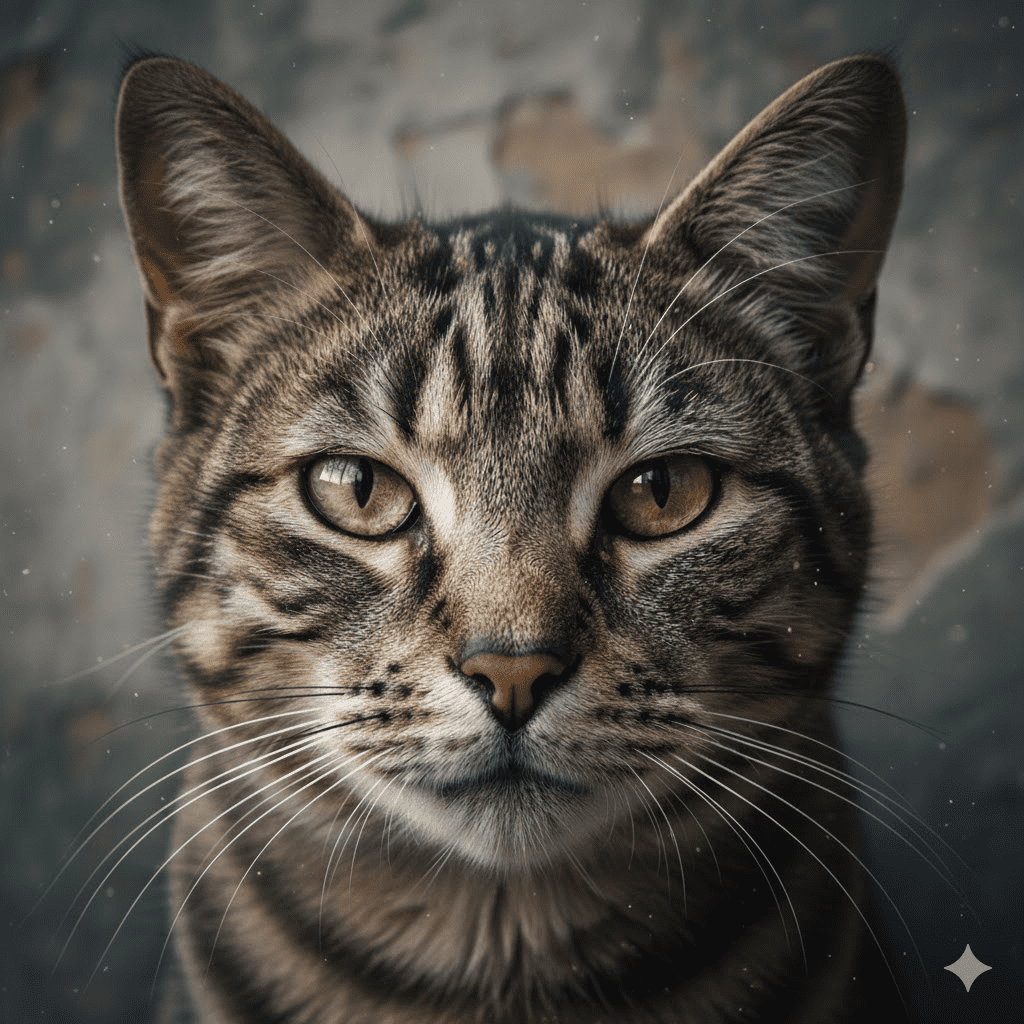 指令: “灵魂的凝视”。一张极致超写实的特写肖像,展现一只年迈且饱经风霜的流浪猫,它的脸部特写充满了生命的痕迹。每一根胡须,每一丝毛发的纹理都清晰可见,毛发间沾染着微小的灰尘和泥土,暗示着它的旅程。猫的眼睛是画面的焦点,眼神深邃而复杂,饱含着岁月的智慧、一丝不易察觉的忧郁,以及对生命坚韧不拔的强大力量。瞳孔中精确地反射着窗外模糊的日落余晖和一缕细微的树影。鼻子和爪垫上的细微褶皱、干燥的质感,甚至皮肤下隐约可见的血管都逼真入微。光线被处理得如同伦勃朗般精妙,强调出猫咪脸部的轮廓和表情,创造出一种既宏伟又私密、既脆弱又坚强的氛围。背景是经过艺术虚化处理的破旧墙壁,其斑驳的纹理和色彩进一步衬托出猫咪主体的深度。这张图片不仅在技术细节上完美无瑕,更在情感和故事性上达到了大师级的水准,令人忍不住想要探究这只猫咪的生命故事。