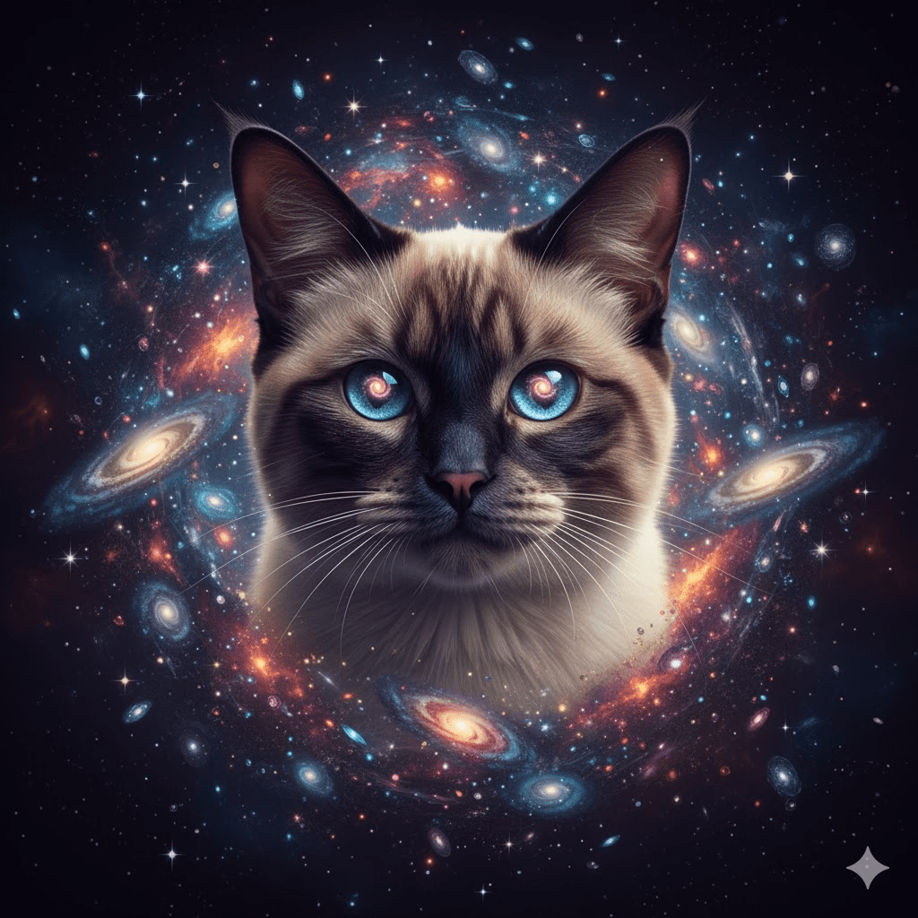 指令: 一只悬浮在宇宙中的暹罗猫,它周围环绕着微型星系和发光的星尘,猫的眼睛反射着远方的星云,它的毛发细节和宇宙背景完美融合,超写实,高分辨率。